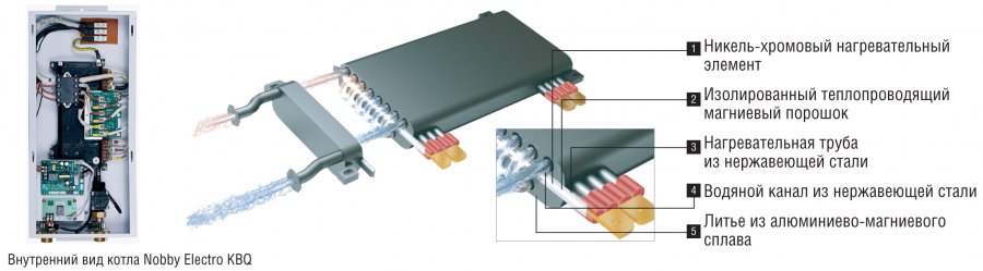 Теплообменник из алюминиево магниевого сплава;(AL - MG) с разделением трубок для теплоносителя (сталь SUS 304) и нагревательного элемента (никель-хром). Защита теплообменника от коррозии и от накипи.